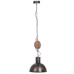Długa lampa industrialna z drewnianym elementem imitującym kołowrotek. Lampa doskonała do loftowej kuchni lub baru.