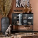 Witryna Vintage Chic Antique A to stylowy mebel z drewna jodły, metalu i szkła, który łączy rustykalny urok z industrialnym charakterem. Czarno-brązowa forma z przeszklonymi drzwiami i delikatnym postarzeniem tworzy wyjątkowy klimat vintage. Idealna do ekspozycji dekoracji, naczyń lub książek w salonie i jadalni.