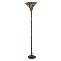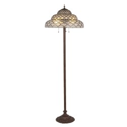 Lampa podłogowa z kolekcji Tffany posiada metalową, zdobioną delikatnymi rzeźbieniami obudowę w kształcie prostokątnej bryły.