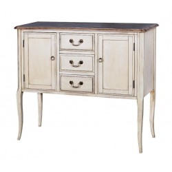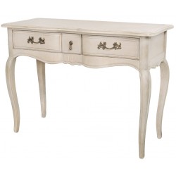 Stylowa, postarzana konsola z szufladami wykonana z drewna topoli i pomalowana na kolor kremowy.