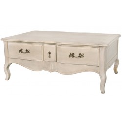 Bielony stolik kawowowy w stylu prowansalskim z uroczymi, ozdobnymi rzeźbieniami.
