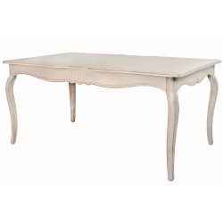 Stół w stylu francuskim z kremową, przecieraną na krawędziach podstawą i bielonym blatem.