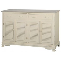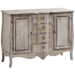 Przecierany kredens w stylu francuskim o kremowym kolorze i eleganckich rzeźbieniach przy nóżkach.