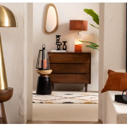 Konsola loft z drewna mango i metalu to elegancki mebel w stylu industrialnym, rustykalnym i japandi. Prosta forma, ozdobna szuflada z geometrycznym frontem oraz praktyczna półka tworzą idealne połączenie funkcjonalności i designu. Doskonale sprawdzi się w przedpokoju, salonie czy sypialni jako stolik pomocniczy lub dekoracyjny akcent.