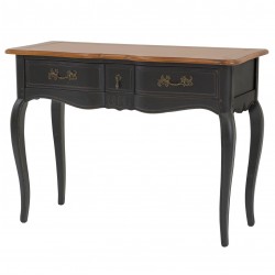 Konsola Perri B w kolorze antycznej czerni to elegancki mebel o klasycznym, francuskim charakterze. Wykonana z drewna mindi i bayur, zachwyca subtelnym połyskiem i lekko giętymi nogami. Stylowy blat w naturalnym odcieniu drewna ociepla całość, tworząc harmonijne połączenie tradycji i nowoczesności. Doskonała do salonu, sypialni lub przedpokoju.