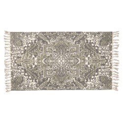 Elegancki dywanik z subtelnym, geometrycznym wzorem w odcieniach szarości i kremu. Miękka tkanina i delikatne frędzle dodają przytulności, a stonowana kolorystyka łatwo komponuje się z różnymi aranżacjami. Idealny jako dekoracyjny akcent w salonie, sypialni czy przy wejściu.