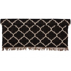 Elegancki dywanik w głębokiej czerni przełamany kremowym, marokańskim wzorem. Wykonany z trwałych włókien, przyjemny w dotyku, ze stylowymi frędzlami na końcach. Nadaje wnętrzu ciepła i graficznego charakteru, świetny do przedpokoju, salonu lub pod stolik kawowy. Łatwy w utrzymaniu, dodaje kontrastu i wyrafinowania każdej aranżacji.