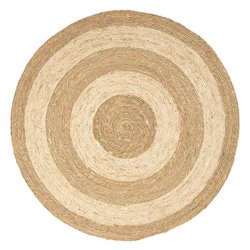 Okrągły dywan pleciony z naturalnych włókien jutowych o stonowanej, dwukolorowej fakturze. Subtelne koncentryczne pasy w beżu i kremie wprowadzają przytulny, organiczny charakter do wnętrza. Trwały i łatwy w utrzymaniu, idealny do salonu, jadalni czy sypialni — doskonale uzupełni aranżacje w stylu boho lub skandynawskim.