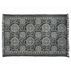 Elegancka, dwubarwna narzuta o bogatym, okrągłym wzorze medalionów i ozdobnych frędzli. Idealna jako koc, narzuta na sofę lub dekoracyjna mata — doda wnętrzu etnicznego, boho charakteru. Trwała tkanina i wyrafinowany kontrast czerni z beżem tworzą uniwersalny akcent do salonu i sypialni.