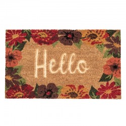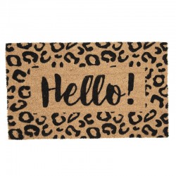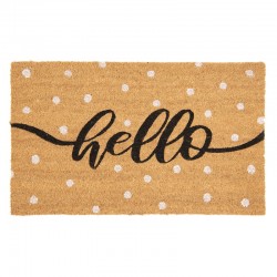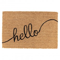Prostokątna wycieraczka wykonana z włókien kokosa z czarnymi zdobieniami przy każdym z boków i czarnym napisem Hello.