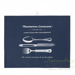 Wykonane z granatowego, bawełnianego materiału ściereczki kuchenne z grafiką sztućców. Przepiękne dodatki do kuchni!