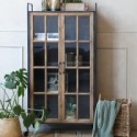 Witryna Vintage Chic Antique A to stylowy mebel z drewna jodły, metalu i szkła, który łączy rustykalny urok z industrialnym charakterem. Czarno-brązowa forma z przeszklonymi drzwiami i delikatnym postarzeniem tworzy wyjątkowy klimat vintage. Idealna do ekspozycji dekoracji, naczyń lub książek w salonie i jadalni.