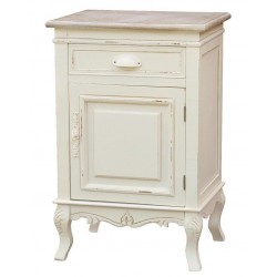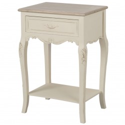 Postarzany stolik nocny w stylu francuskim z dwoma szufladkami i eleganckimi rzeźbieniami.