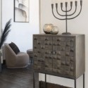 Przeszklona komoda wykonana z drewna z recyklingu. Prosimy pamiętać, że wszystkie meble Grimaud są wyjątkowe i nie ma dwóch takich samych. Oznacza to, że mogą nieco różnić się kształtem, rozmiarem i rodzajem drewna.