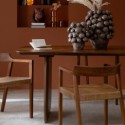 Drewniane krzesło w kolorze jasnego brązu mające ozdobne sznureczki na zaokrąglonym oparciu. Meble Japandi Lone to minimalistyczne dopełnienie każdej aranżacji.