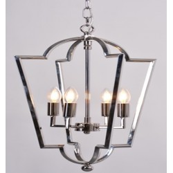 Srebrny żyrandol Belldeco z czterema źródłami światła w kształcie niskich świec.