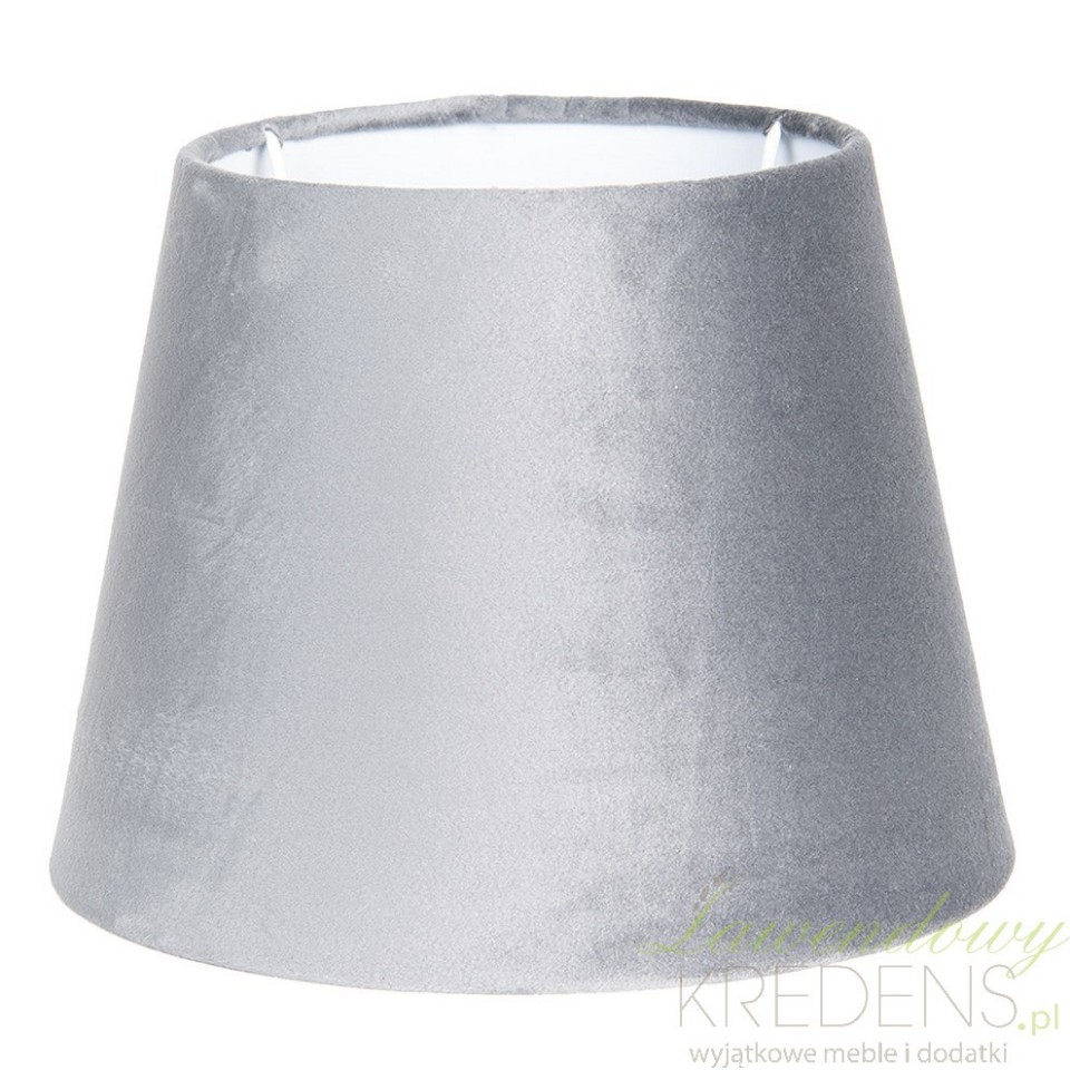 Aksamitny abażur o szarym wybarwieniu upiększy wygląd każdej lampy wykonanej z drewna jak również solidnych lamp metalowych.