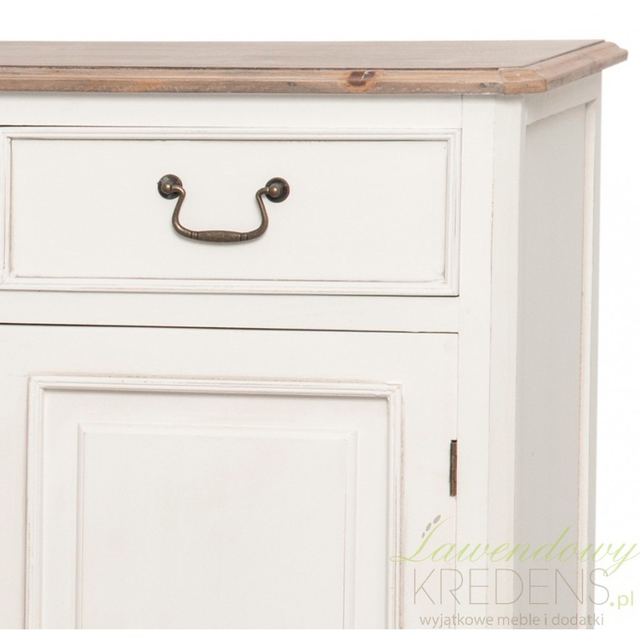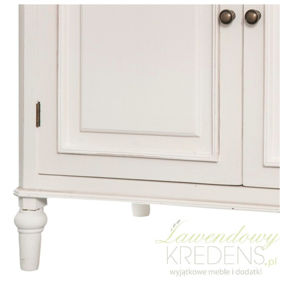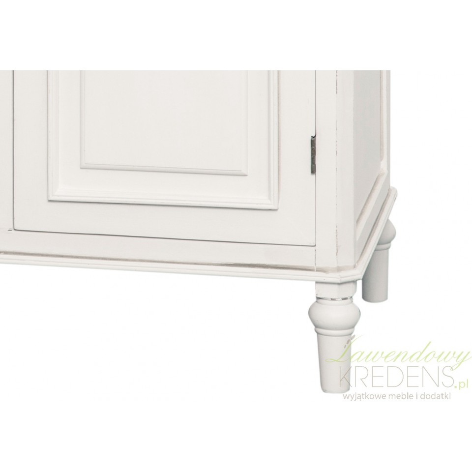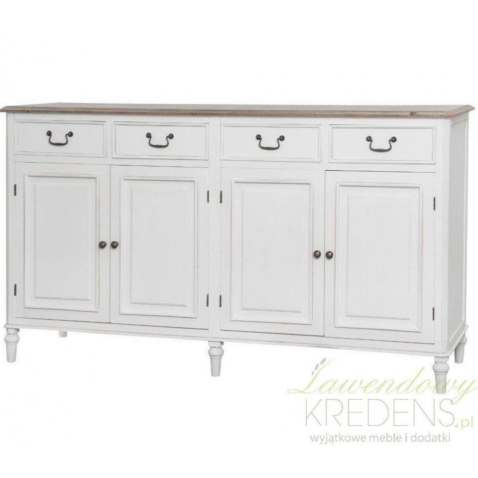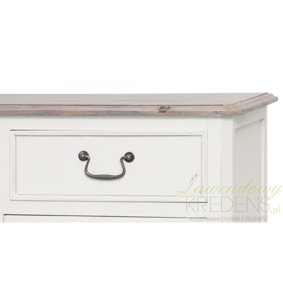 Biała, bardzo szeroka komoda komoda prowansalska z dodatkowymi nogami w środkowej części, dla utrzymania stabilności. Kolor powierzchni wspaniale komponuje się z delikatnie bielonym blatem komody z naturalnego drewna, z widocznymi słojami i odbarwieniami! Cztery zamykane półki i cztery szuflady, miejsce o którym marzysz!