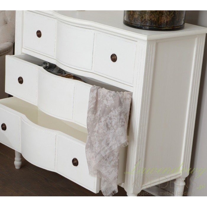 Miła dla oka, biała komoda prowansalska idealna zarówno do sypialni, przedpokoju czy do salonu. Jej uniwersalnośc pozwala na wykorzytsanie jej we wnętrzach nowoczesnych jak i w stylu prowansalskim czy francuskim. Fronty szuflad ozdobione jedynie metalowymi uchwytami potwierdzają tę tezę!