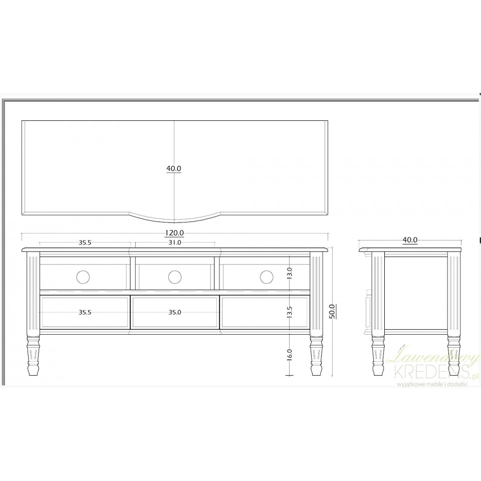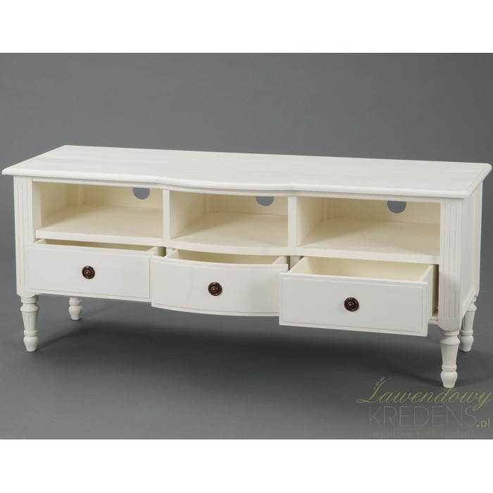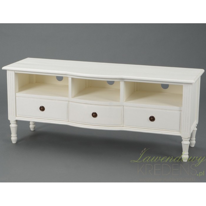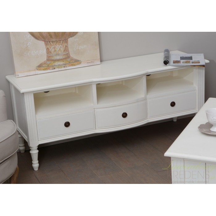 Meble w stylu prowansalskim stanowią delikatny i subtelny styl, pełen bogatych zdobień w urządzaniu wnętrz. Komoda rtv to szeroki, biały mebel z trzema otwartymi półeczkami i trzema szufladkami. Mogą posłużyć jako miejsce na dodatkowo urządzenie. Komoda prowansalska z kolekcji Adele ma krótkie, pięknie rzeźbione nogi i długi blat, na którym może zostać usytuowany telewizor.