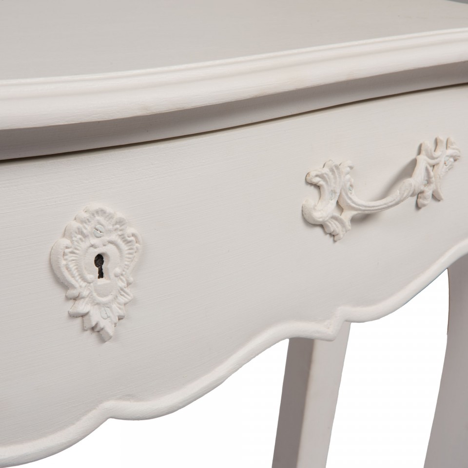 Konsola prowansalska to bardzo atrakcyjny mebel do wykorzystania jako toaletka lub biurko. Możesz ją ustawić w miejscu przy ścianie w salonie lub w przedpokoju. Kremowa konsola w stylu prowansalskim ma dziurkę na klucz oraz podłużną, pofalowaną szufladę zdobioną rzeźbionymi uchwytami. Prezentuje się niezwykle efektownie i jest praktycznym uzupełnieniem aranżacji. Polecamy meble prowansalskie od francuskiego proucenta!
