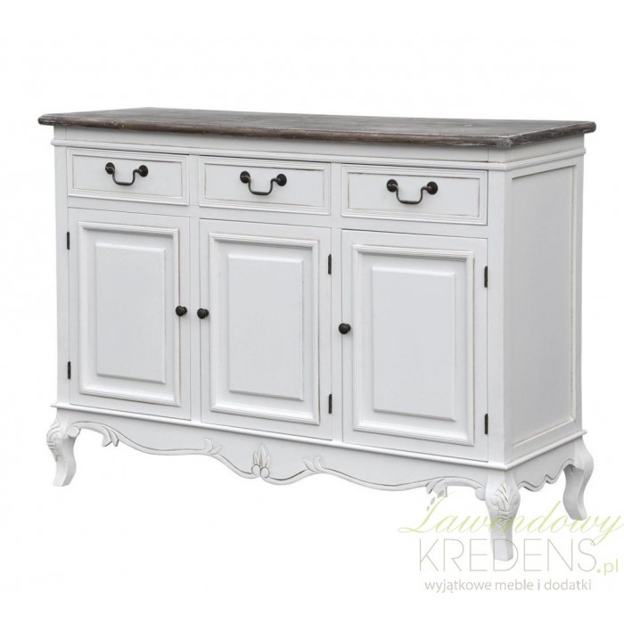 Komoda prowansalska wykonana jest z drewna i pomalowana na biało. Komoda Rimini White to piękny mebel z antycznym blatem w kolorze brązu.
