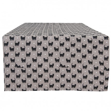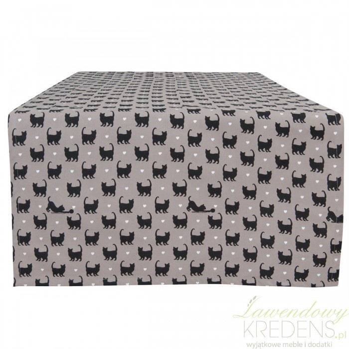 Bieżnik stołowy w kolorze beżowym ma kształt prostokąta i koci wzór. Czarne koty znajdujące się na bieżniku są gęsto rozmieszczone i przyjmują różne pozycje. Pomiędzy kotami znajdują się białe serduszka. Bawełniany bieżnik na stół od Clayre&Eef to propozycja do ozdoby stolika kawowowego lub ławy w salonie.