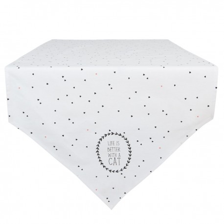 Bieżniki prowansalskie to jedne z możliwości oprawy stołu. Zaproś gości na przyjęcie i udekoruj stół ślicznym bieżnikiem w białym kolorze by podkreślić jego wyjątkowy charakter. Bieżnik na stół z linii Clayre&Eef zdobiony uroczą aplikacją z kotem i trójkątami w ciemnym kolorze. Bieżnik z kotem wykonany jest z tkaniny bawełnianej, co zapewnia komfort w użytkowaniu oraz szybkie i proste prasowanie.