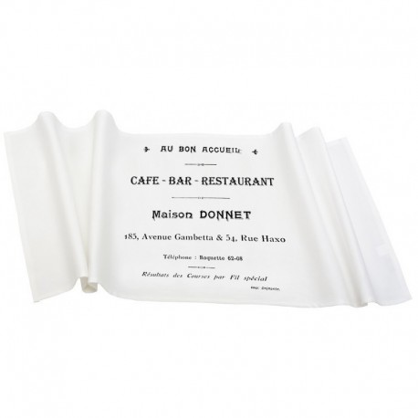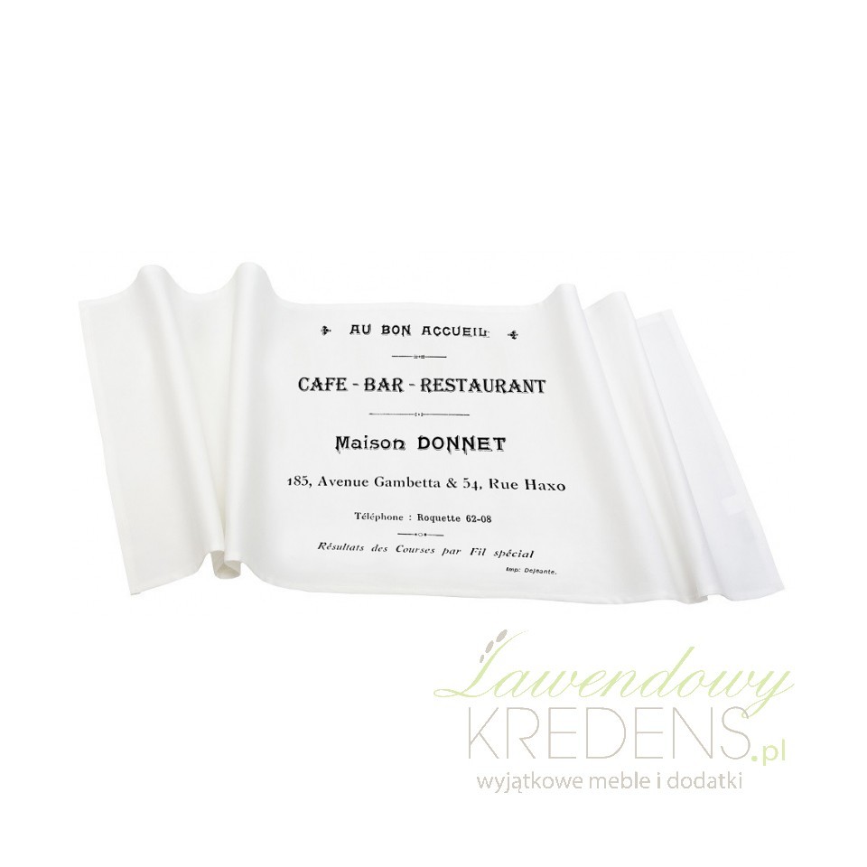 Białe bieżniki na stół w stylu francuskim ozdobione czarnymi, francuskimi napisami.