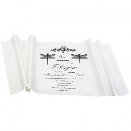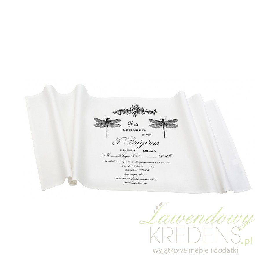 Prowansalski bieżnik na stół marki French Home z napisami w języku francuskimi oraz ważkami. Bieżnik ma biały kolor, a ozdobna grafika znajduje się na środku bieżnika. Do tego produktu można dobrać serwety oraz bieżniki o innym rozmiarze, a także poduszki ozdobne i poduszki na krzesła z tym samym wzorem.