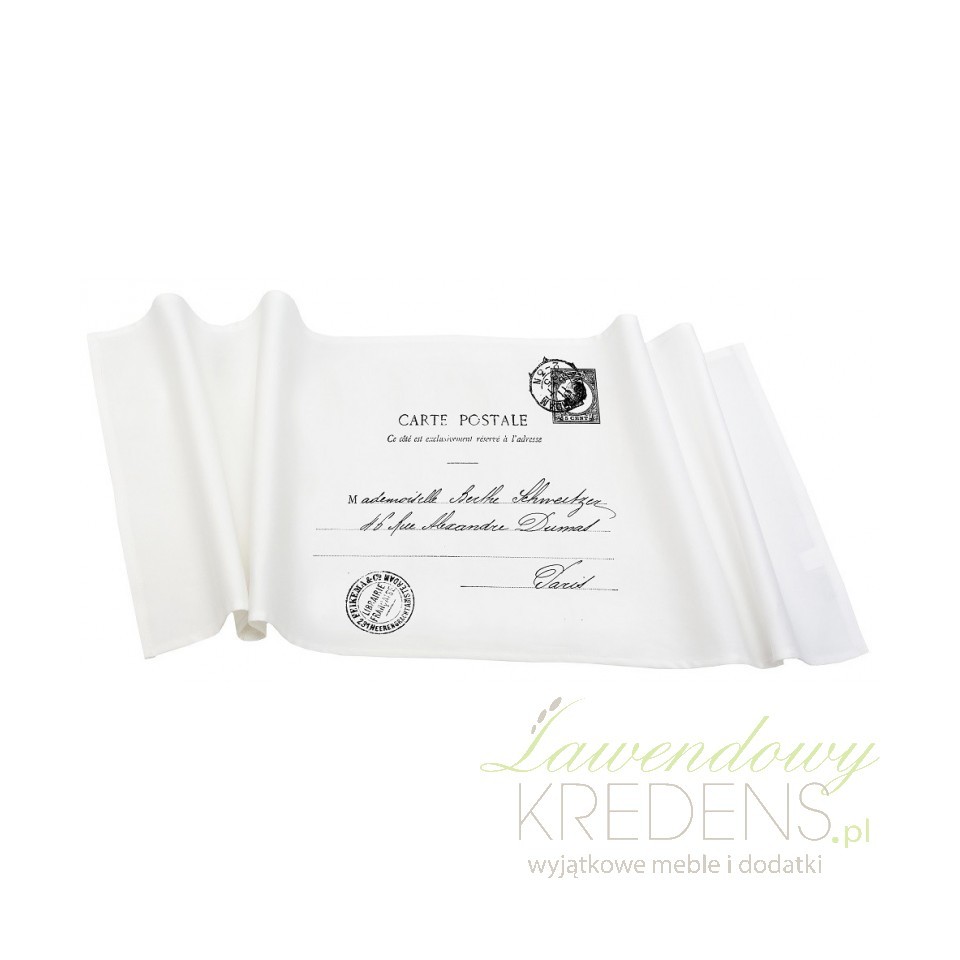 Bieżniki French Home wykonane w stylu prowansalskim to interesujące, bawełniane tekstylia stołowo autorstwa polskiej firmy French Home. Na białej powierzchni bieżnika umieszczono czarną grafikę imitującą kartkę pocztową. Napis jest niezwykle trwały i nie zniknie podczas prania. Polecamy!