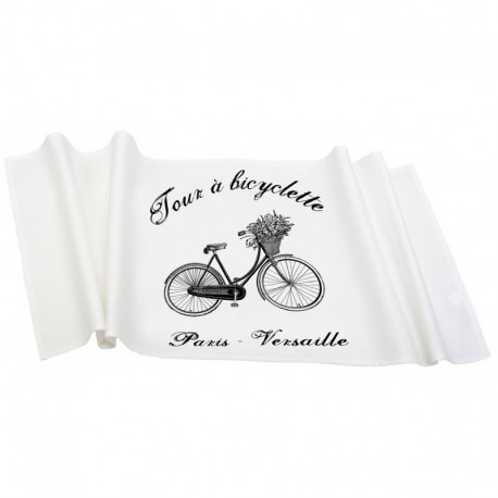 Bieżnik na stół French Home z rowerem oraz czarnymi, francuskimi napisami.