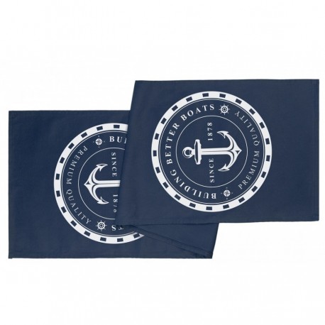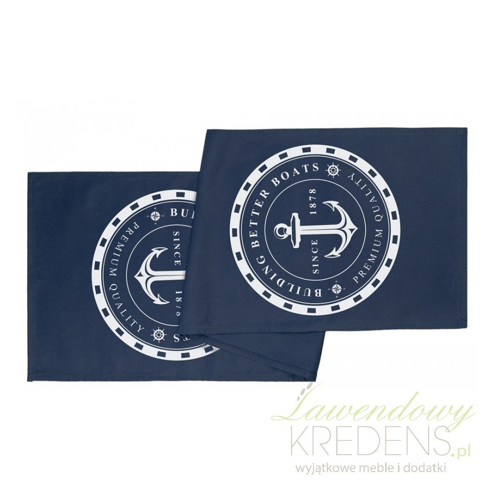 Granatowe bieżniki w stylu marynistycznym, na których znajdują się dwa takie same, marynistyczne wzory. Bieżniki wykonane są z najwyższej jakości, stuprocentowej bawełny. Świetnie sprawdzą się we wnętrzach urządzonych w stylu marynistycznym, ale będą też ciekawym dodatkiem do pomieszcze ń urządzonych w innej stylistyce.