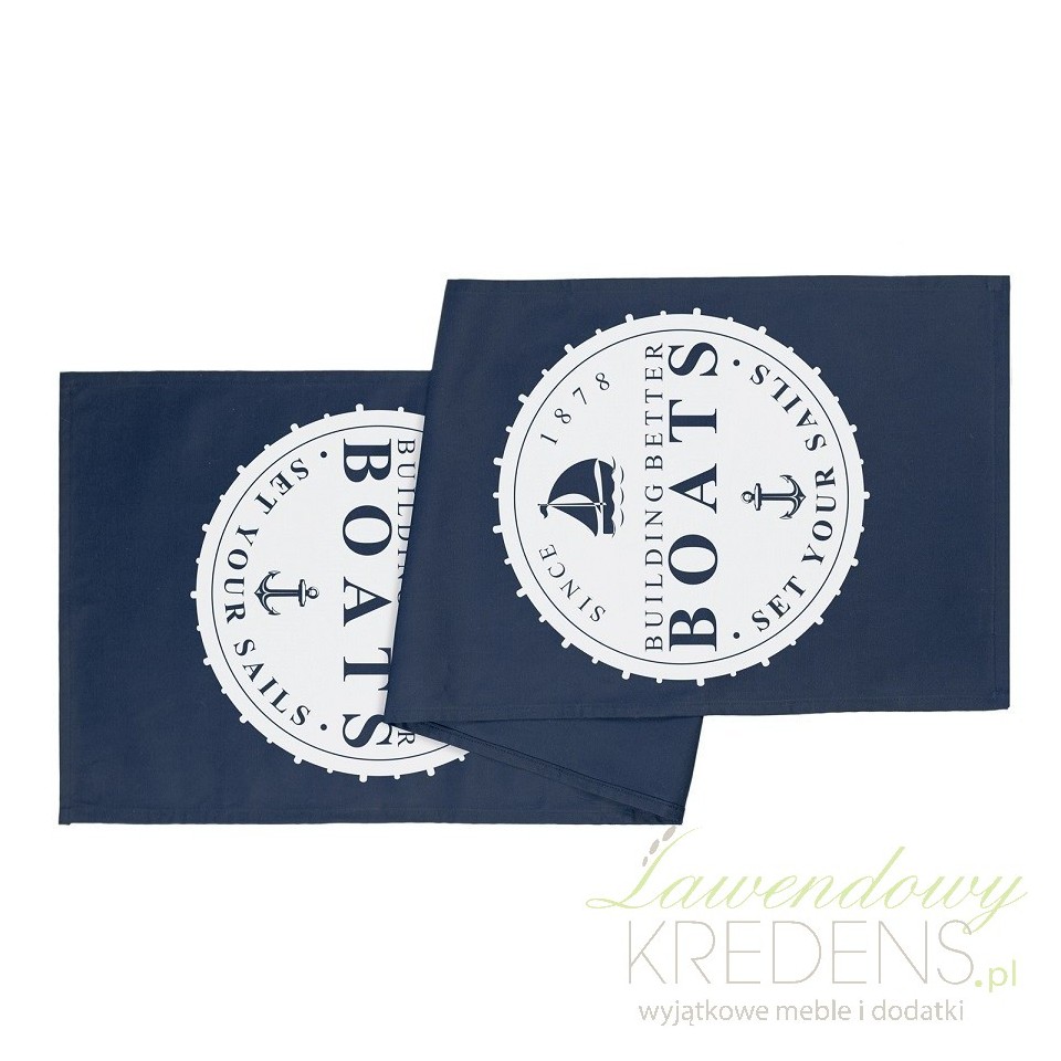 Bawełniane bieżniki na stół polskiej produkcji, wykonane ze 100% bawełny. Na granatowych bieżnikach znajdują się dwa białe wzory z napisem BOATS, motywem żaglówki oraz kotwicy.