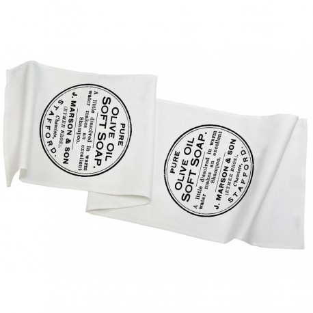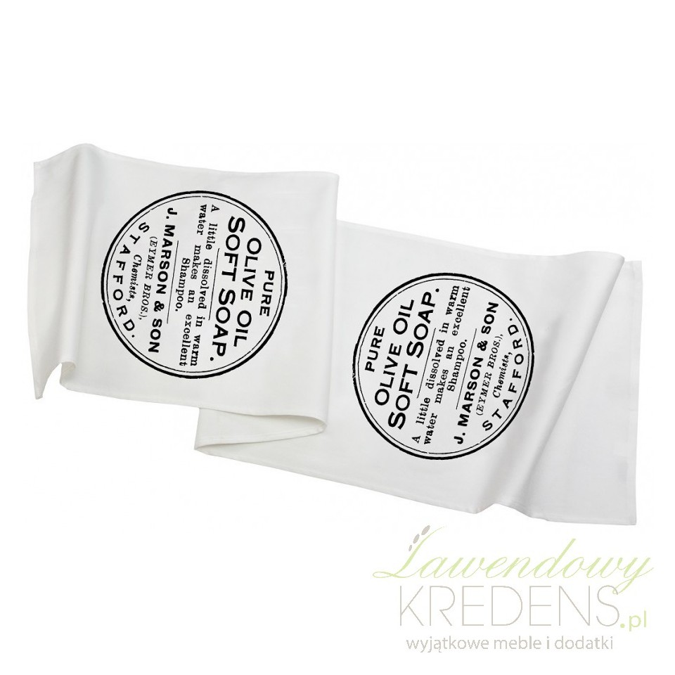 Eleganckie białe bieżniki stołowe z nadrukowanymi, czarnymi emblematami w stylu retro. Zobacz koniecznie!