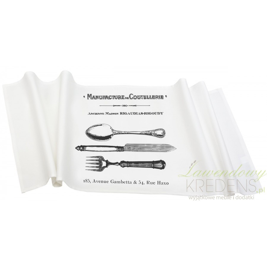 Długie bieżniki na stół z kolorze białym z czarną grafiką sztućców polskiej marki French Home. Polecamy!