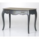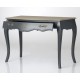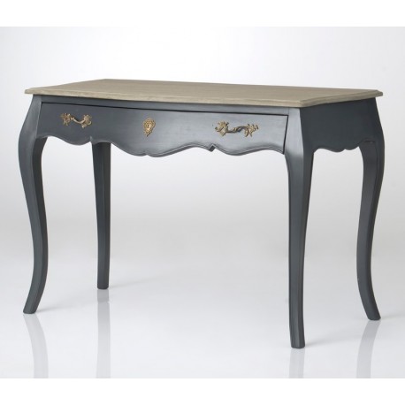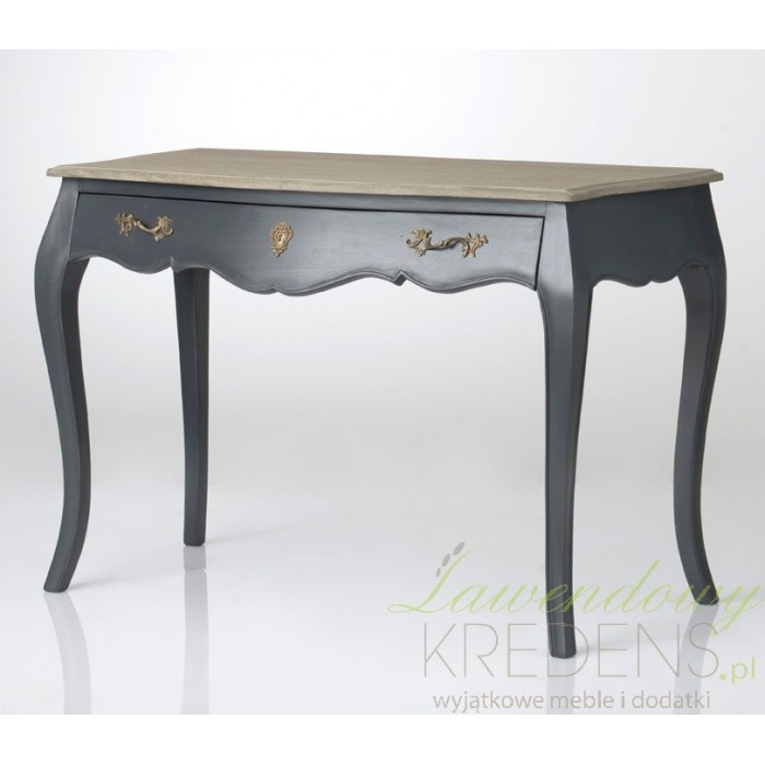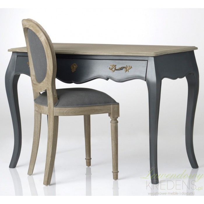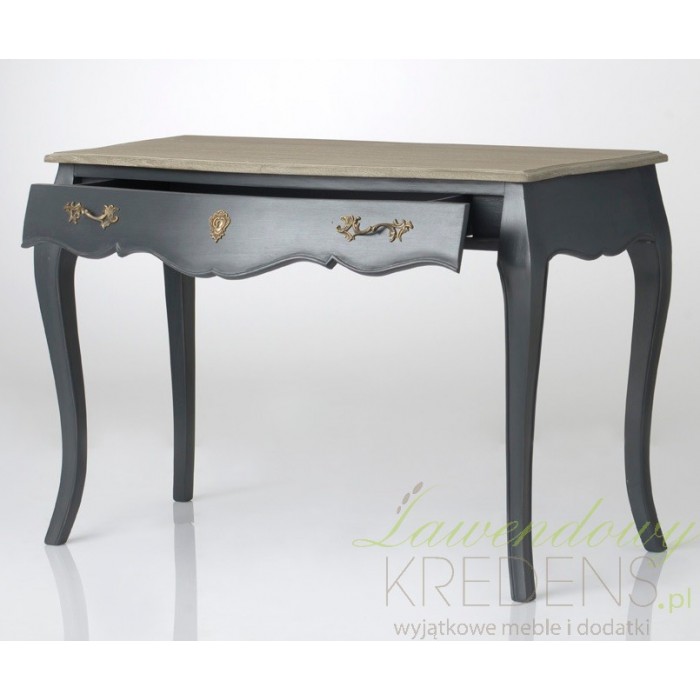 Czarne biurko prowansalskie prosto od francuskiego producenta ma duży, prostokątny blat w kolorze posiwiałego brązu.