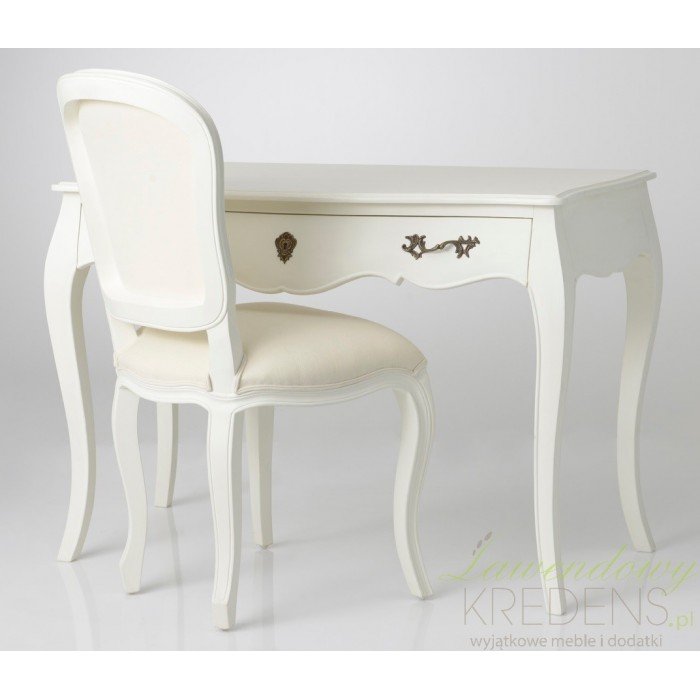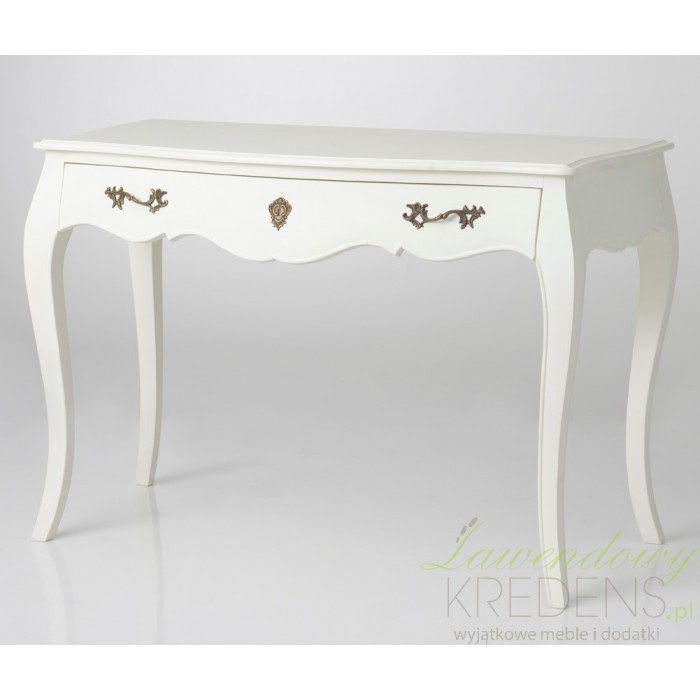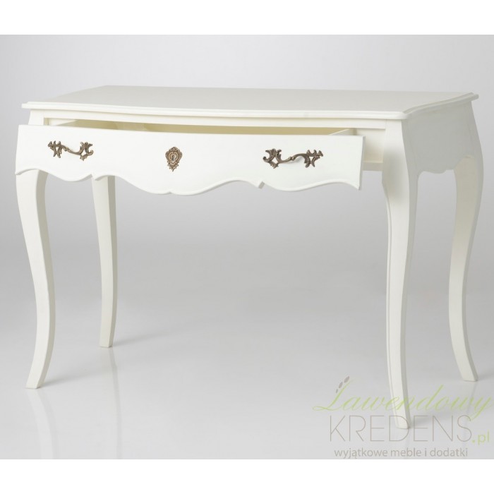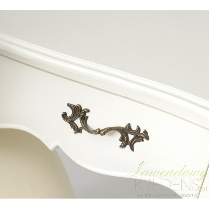 Wybierając meble prowansalskie do biura warto mieć na uwadze ich praktyczność i wygląd, który uzupełni całą aranżację. Biurko prowansalskie jest wykonane w kolorze jasnego kremu i ma metalowe, miedziane uchwyty. Uchwyty znajdują się po bokach szuflady i są efektownie wykute z metalu. Kremowe biurka w stylu prowansalskim, to meble, przy których każdą pracę wykonasz z przyjemnością.