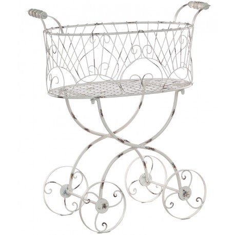 Metalowe meble są teraz na czasie. Różne wzory, kolory, zastosowania. Przepiękny kwietnik metalowy  firmy Aluro, wykonany na kształt wózka z czterema kółkami, posiada ażurowe zdobienia z motywem serc. Zadbano o najdrobniejsze szczegóły. Przetarcia mają nadawać wrażenie, że meble są starsze niż wyglądają.