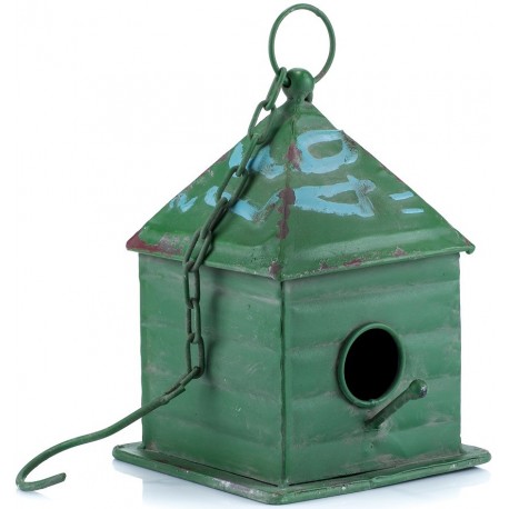 Zielony domek ujęty w sześcianie z małym zgrabnym daszkiem. Przymocowany uchwyt i łańcuch do powieszenia. Nie jest powiedziane, że nie będzie też świetną ozdobą do domu.