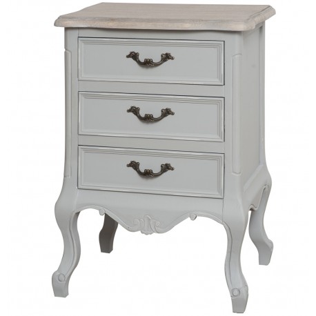 Jasno szara szafka catania, z lekko pofalowanymi nogami i aż trzema szufladami.