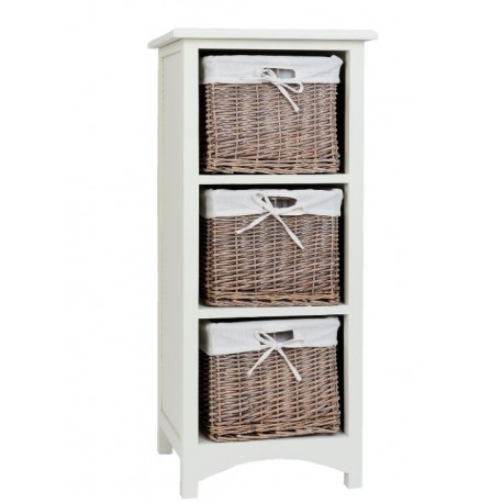 Biała szafka prowansalska, mająca trzy otwarte półki, wypełnione głębokimi koszami, zaprezentuje się niezwykle nowocześnie w pomieszczeniu takim jak łazienka.