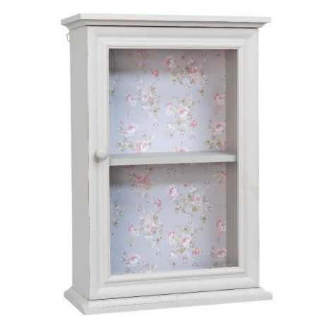 Szafeczka w jasno szarym kolorze z przeszklonymi drzwiczkami za którymi widoczna jest tylna ścianka na której znajdziemy kwiatowy motyw.
