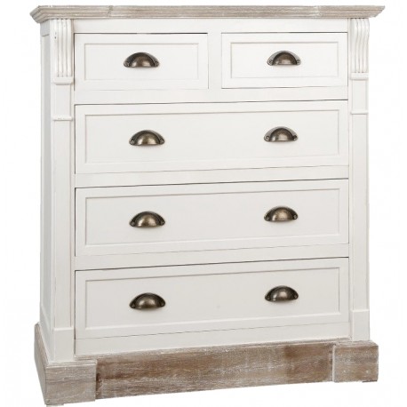 Biała komoda z lekkimi bieleniami, to doskonały przykład szafki w stylu prowansalski, której proste wykończenie daje nam możliwość ustawienia jej w każdej aranżacji. Posiada trzy większe i dwie mniejsze szuflady.