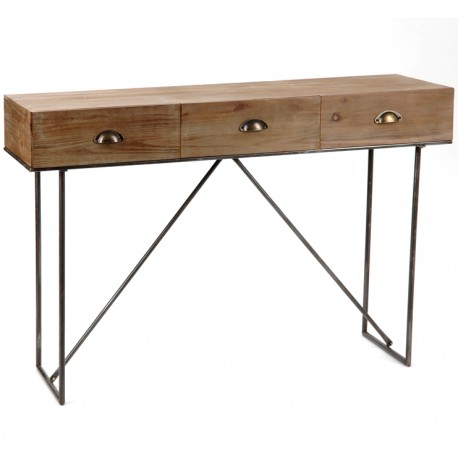 Tutaj mamy konsolę w typowym wykonaniu wskazującym na styl industrialny, ponieważ jej metalowa podstawa ma czarny kolor, a także trzy półokrągłe półki drewniane w brązowym kolorze. Takie konsole najczęściej można spotkać w kuchni czy też przedpokoju. Jednak meble industrialne można umieścić spokojnie w każdym domowym pomieszczeniu.