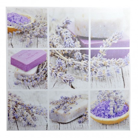 Drewniana tablica w jasnych kolorach mająca motyw fioletowej lawendy, mający niewielki zegar za szybką. To ciekawy dodatek, który w każdym swoim szczególe podkreśla styl prowansalski.