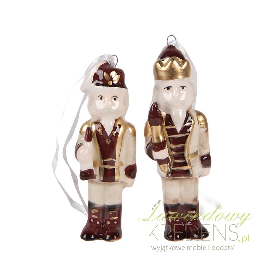 Zawieszki Clayre & Eef w formie Dziadków do Orzechów to eleganckie ceramiczne ozdoby choinkowe w odcieniach złota i bordo. Klasyczny motyw baletowy wnosi do wnętrza nutę tradycji i świątecznego blasku, tworząc bajkowy klimat Bożego Narodzenia.