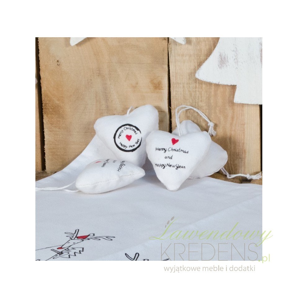 Komplet czterech materiałowych zawieszek z dwiema różnymi grafikami.