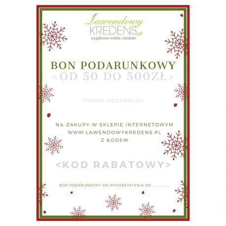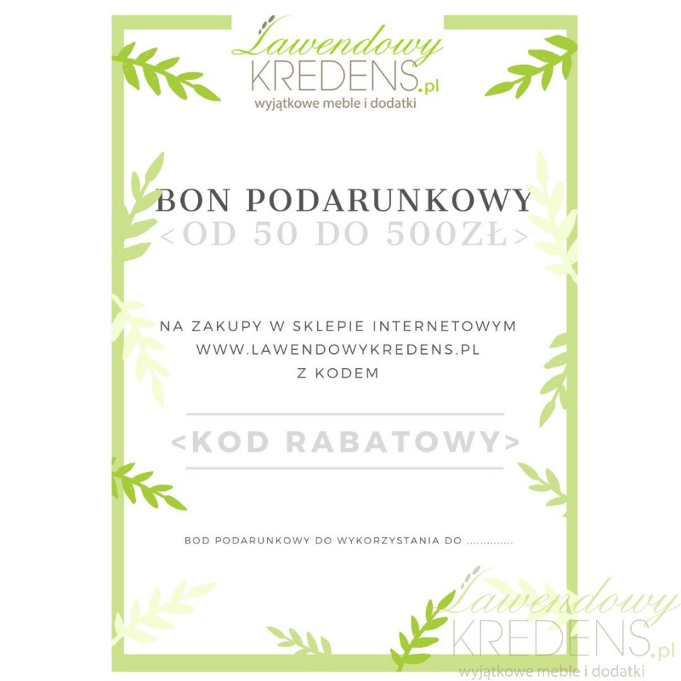 Zdecyduj się na bon podarunkowy o wybranej przez Ciebie wartości na zakupy dowolnych produktów ze strony naszego sklepu internetowego Lawendowy Kredens! Kupując bon podarunkowy nie będziesz musiał marnować czasu na chodzenie po sklepach, a obdarowana przez Ciebie osoba na pewno będzie zadowolona z prezentu! Sama wybierze sobie to, co najbardziej jej się podoba!