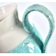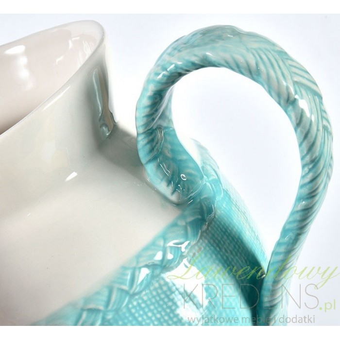 Dzban Beldleco na napoje został wykonany z ceramiki i ręcznie pomalowany. Niebieska część wazonu oraz uchwyt wyglądają jak otulone wełnianym materiałem, a to wszystko za sprawą odpowiedniej techniki malowania i delikatnych rzeźbień. Górna część wazonu z dziobkiem ma biały kolor. Dodatki Belldeco do kuchni efektownie zaprezentują się w przeszklonej witrynie.